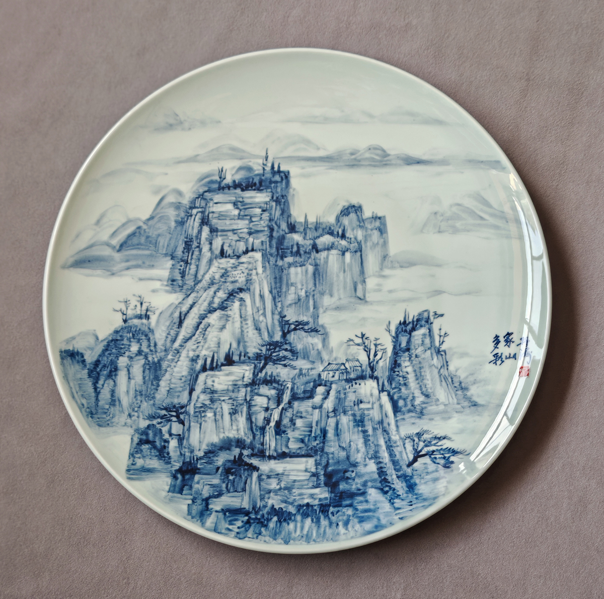 丁邦海《多彩家山》骨瓷青花盘,直径300mm-丁邦海刻瓷|丁邦海 黄玉双刻瓷艺术