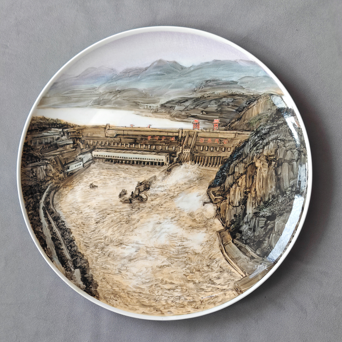 丁邦海《三门峡水电站》釉上彩绘盘,直径370mm-丁邦海刻瓷|丁邦海 黄玉双刻瓷艺术