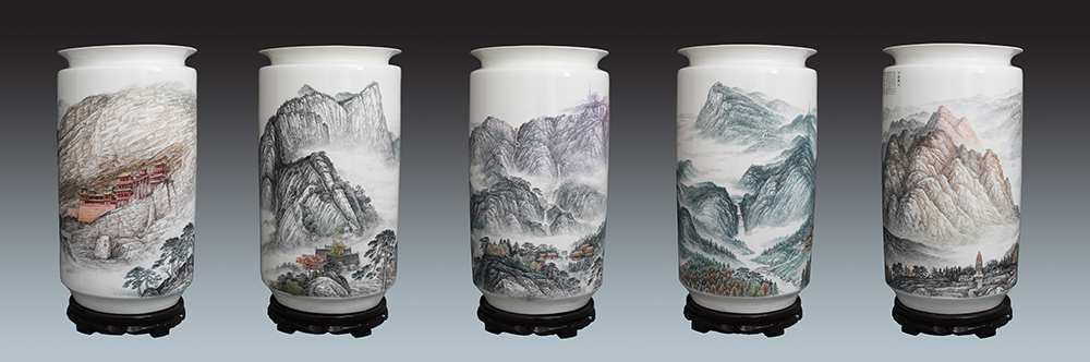 《中华五岳雄千古系列作品之一——北岳恒山》刻瓷瓶,高65cm.
