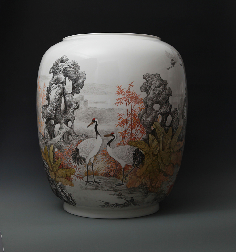 丁邦海《竹石仙鹤图》刻瓷瓶 高550mm