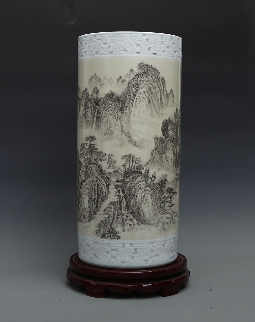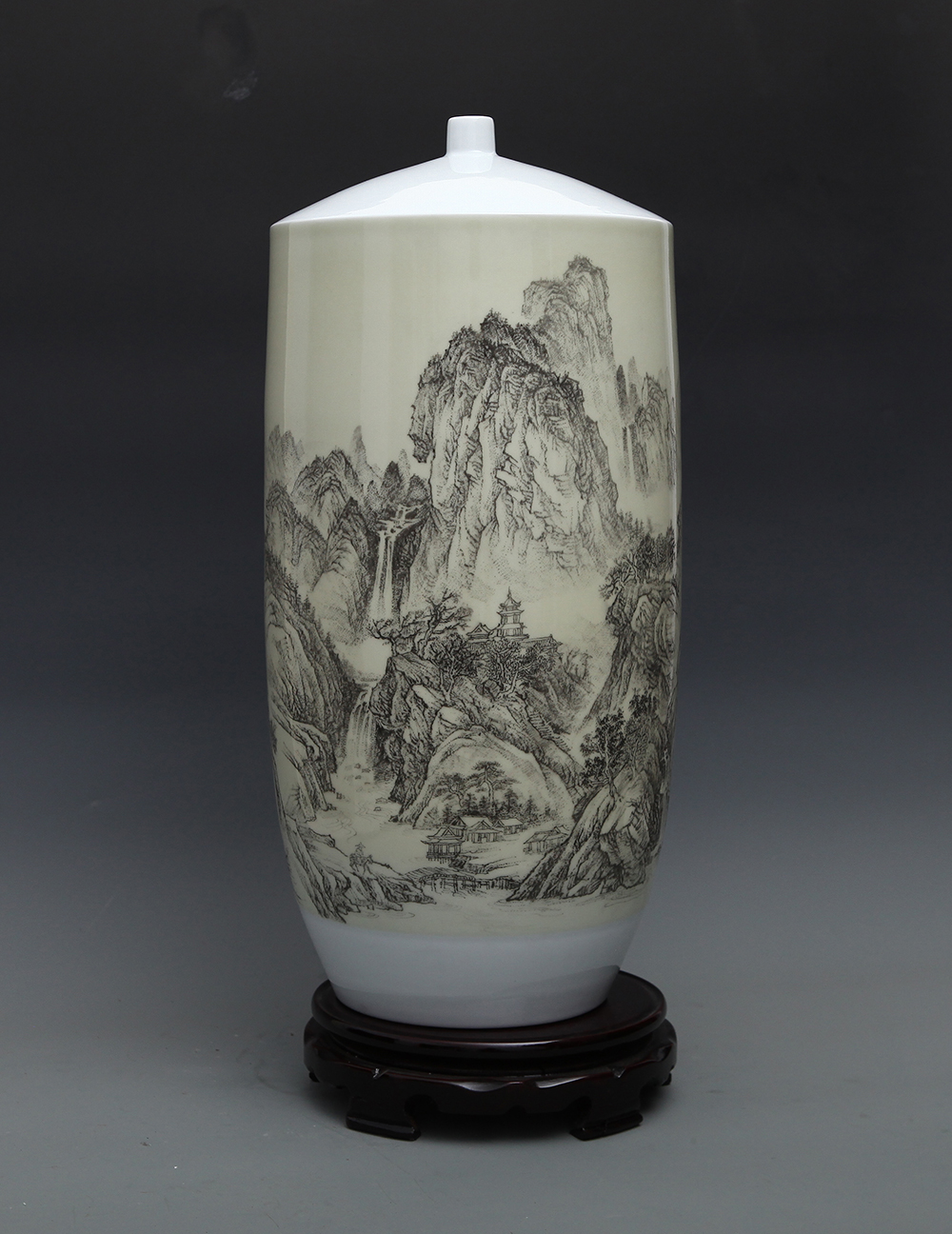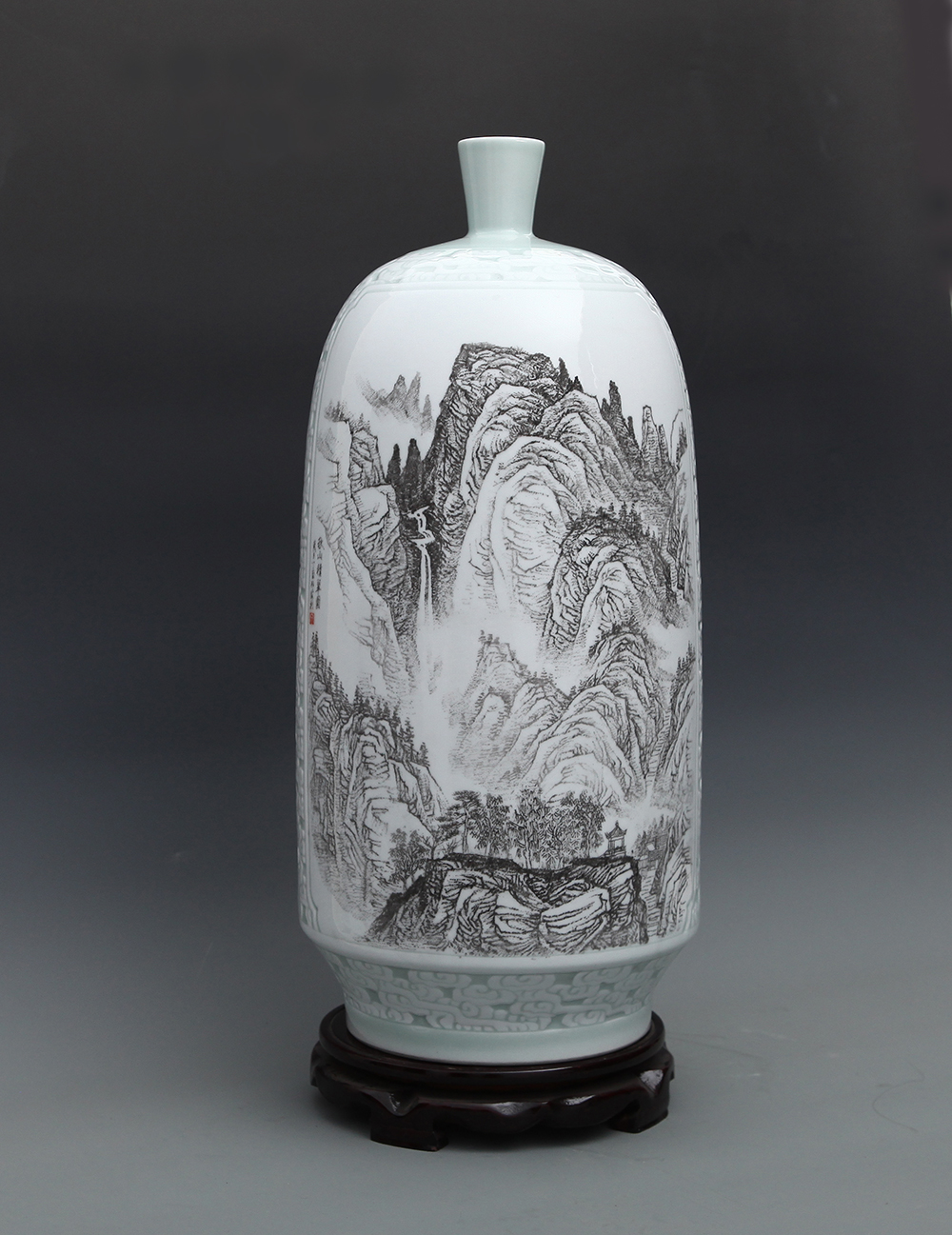 丁邦海《云壑鸣泉》刻瓷瓶 高50厘米