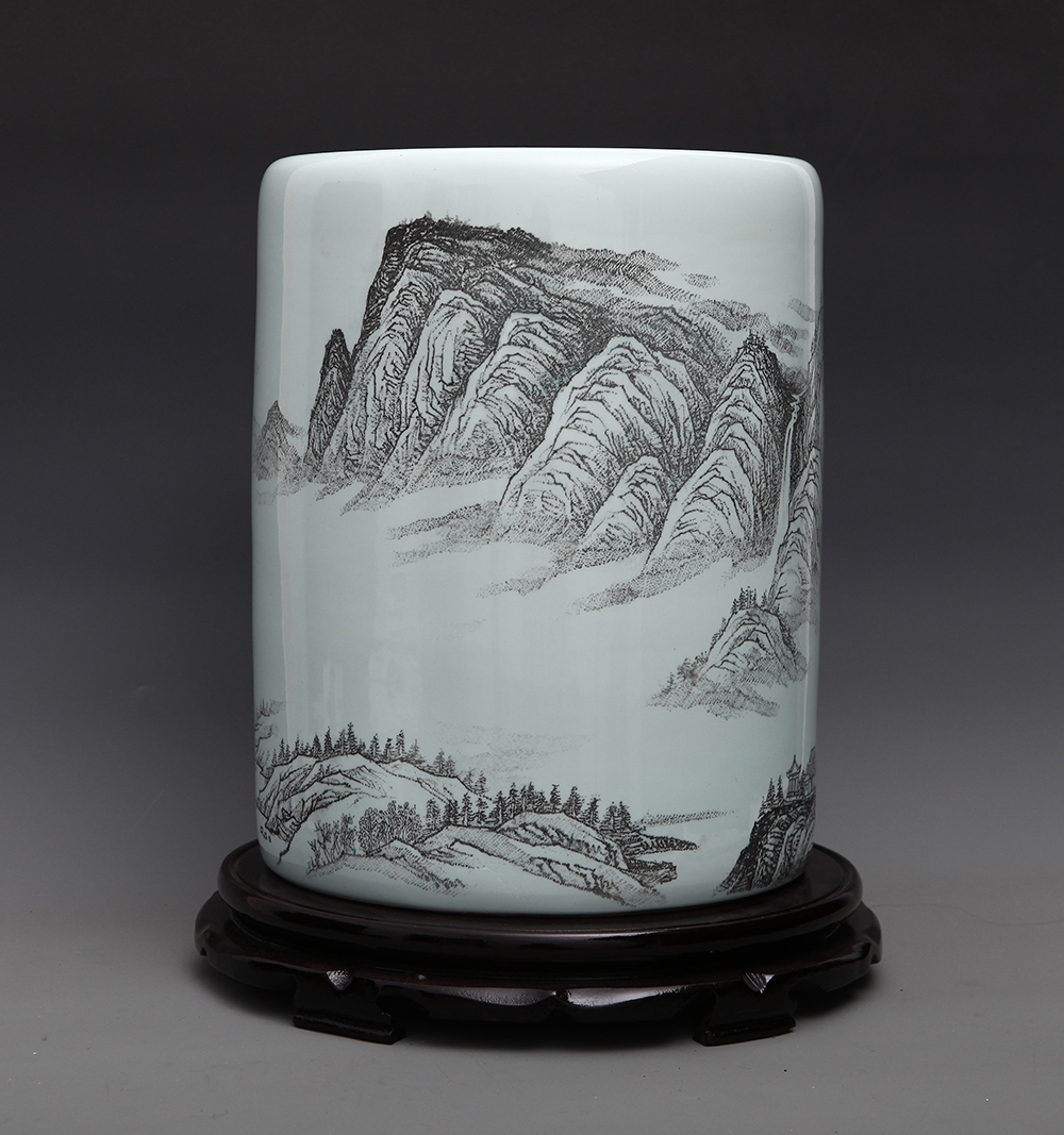 丁邦海《茂林远岫图》刻瓷瓶 高35厘米