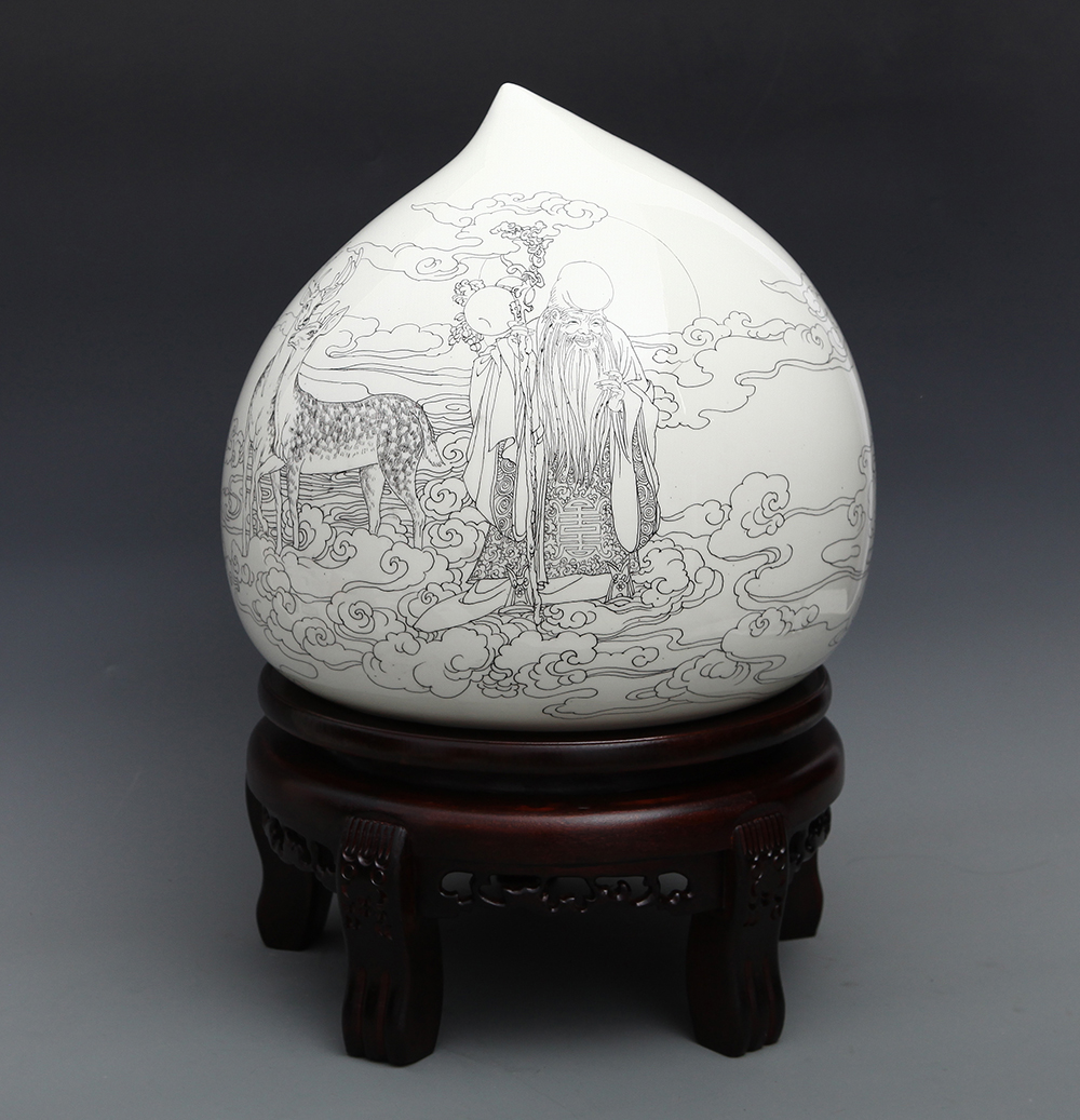 丁邦海 《南极老人应寿图》刻瓷瓶 高350mm