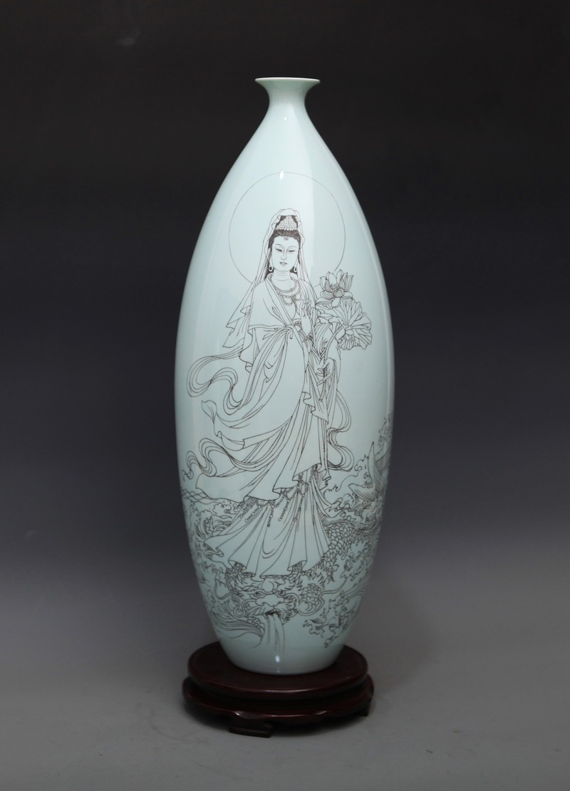 丁邦海《渡海观音》刻瓷盘 高62厘米