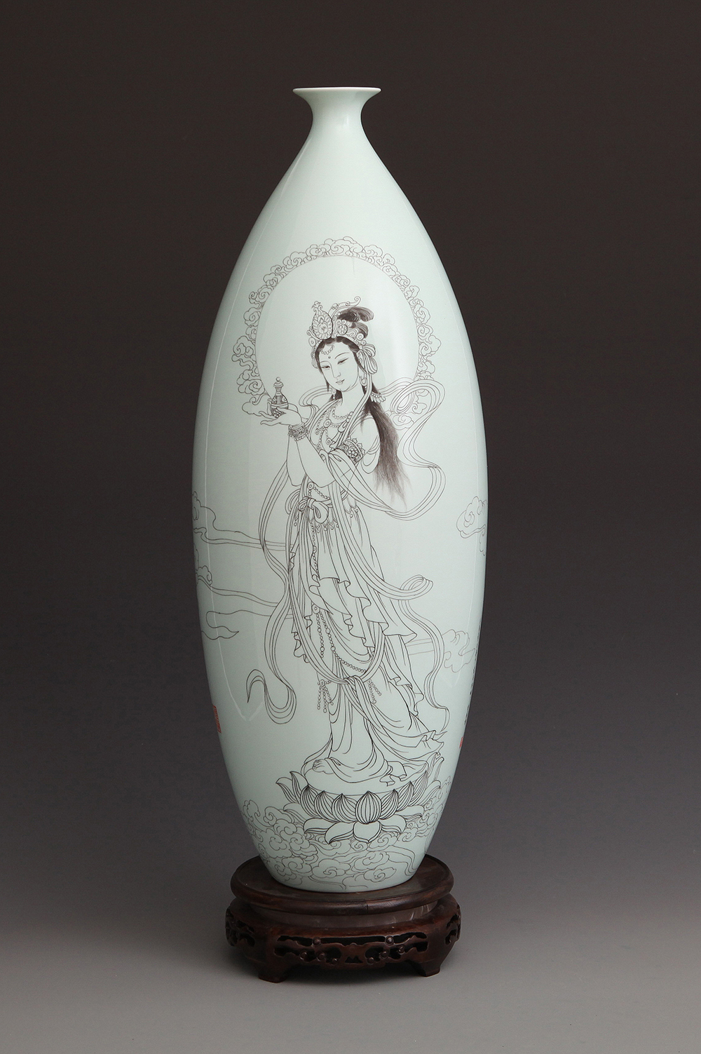 丁邦海《持瓶观音保平安》刻瓷瓶 高400mm