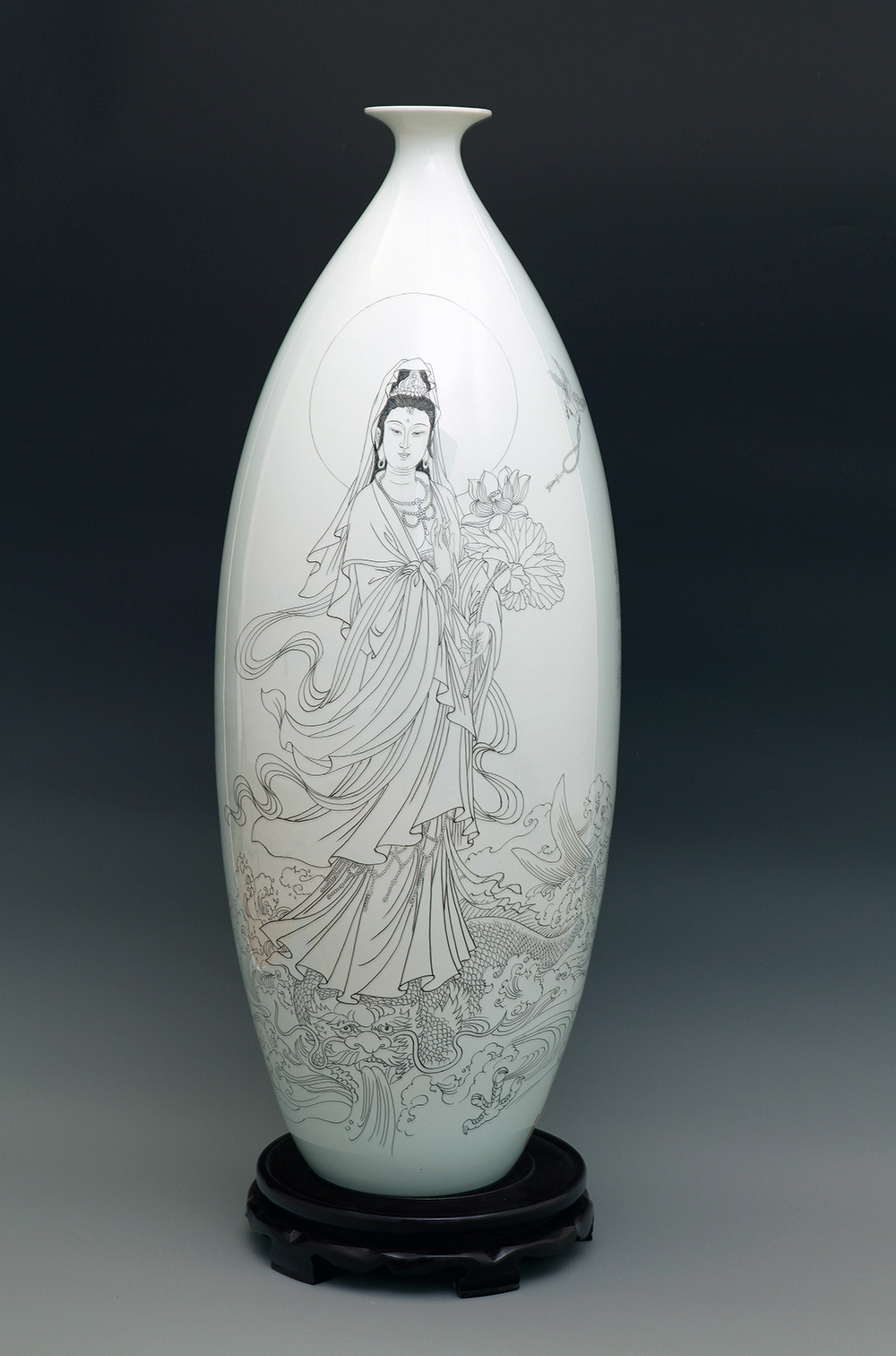 丁邦海《持瓶观音保平安》刻瓷瓶 高510mm,