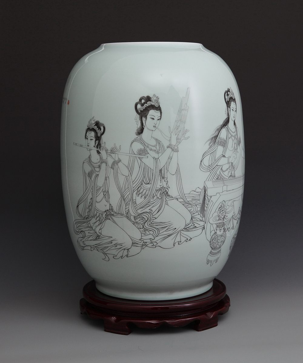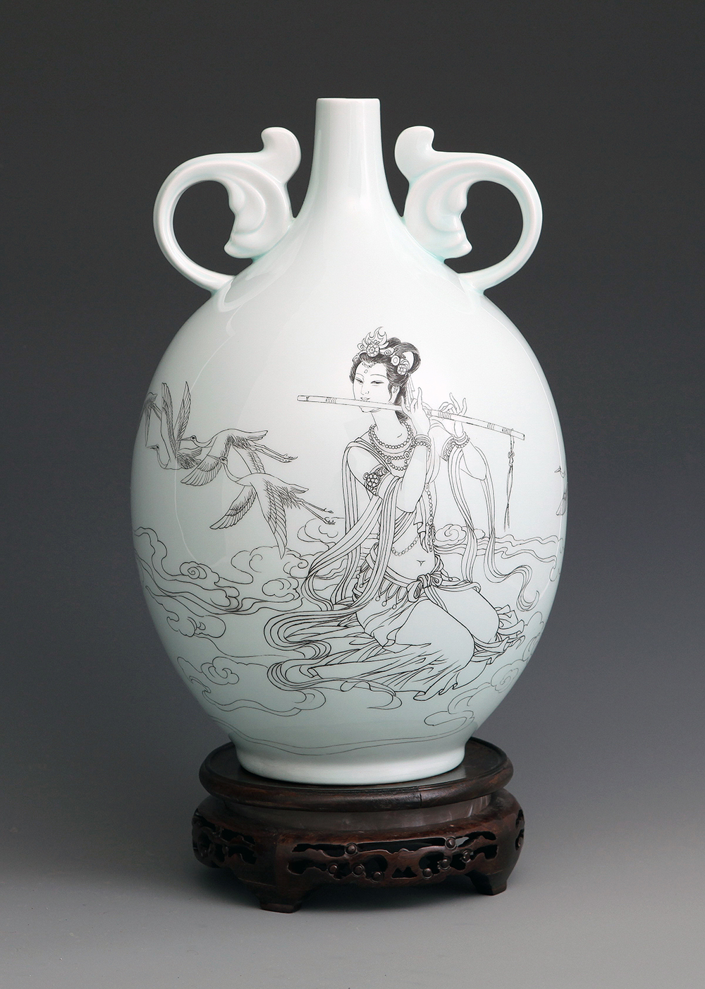 丁邦海《一曲佳音送祝福》刻瓷瓶 高320mm。
