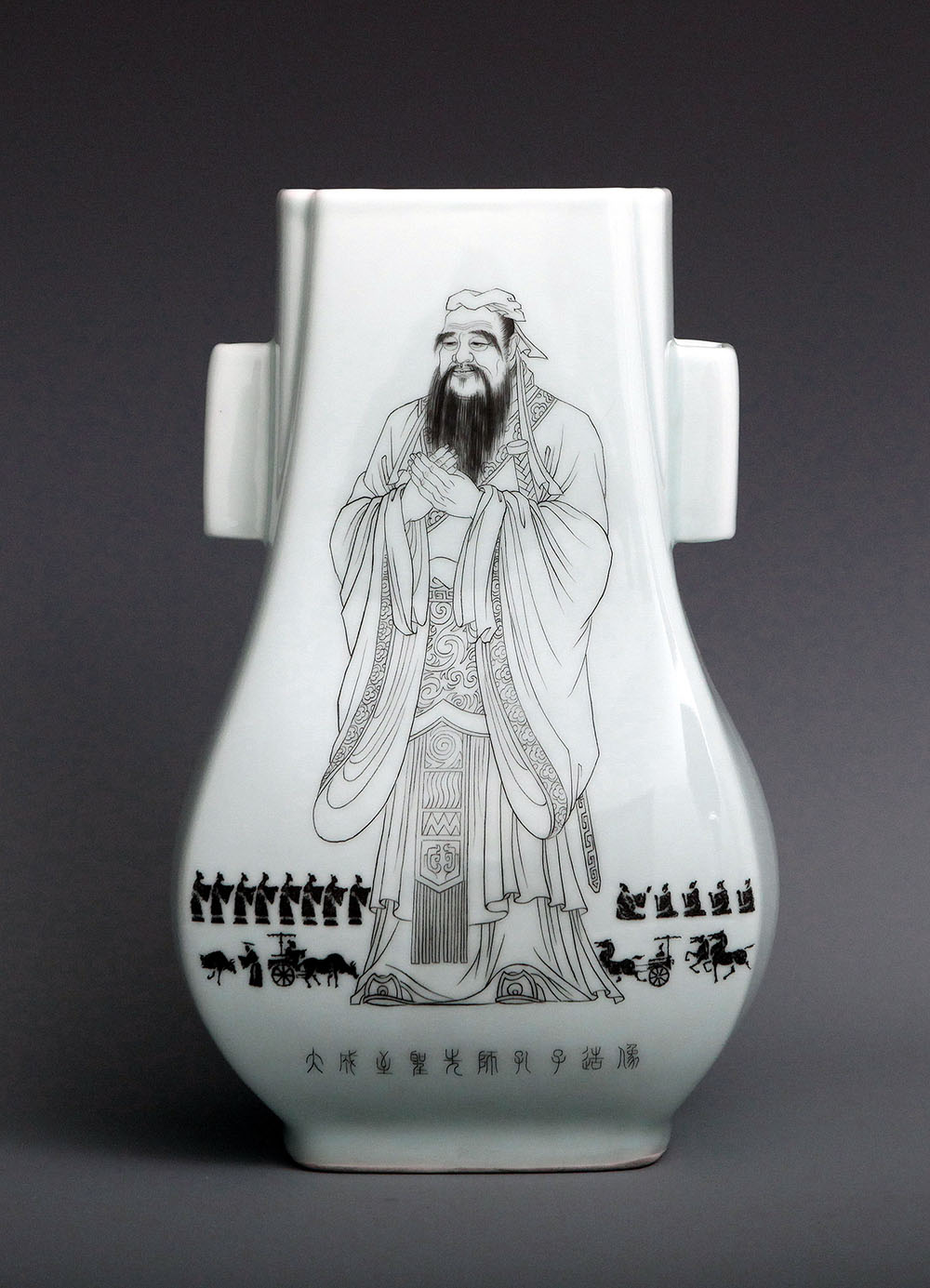 丁邦海《大成至圣先师孔子造像》刻瓷瓶 高350mm
