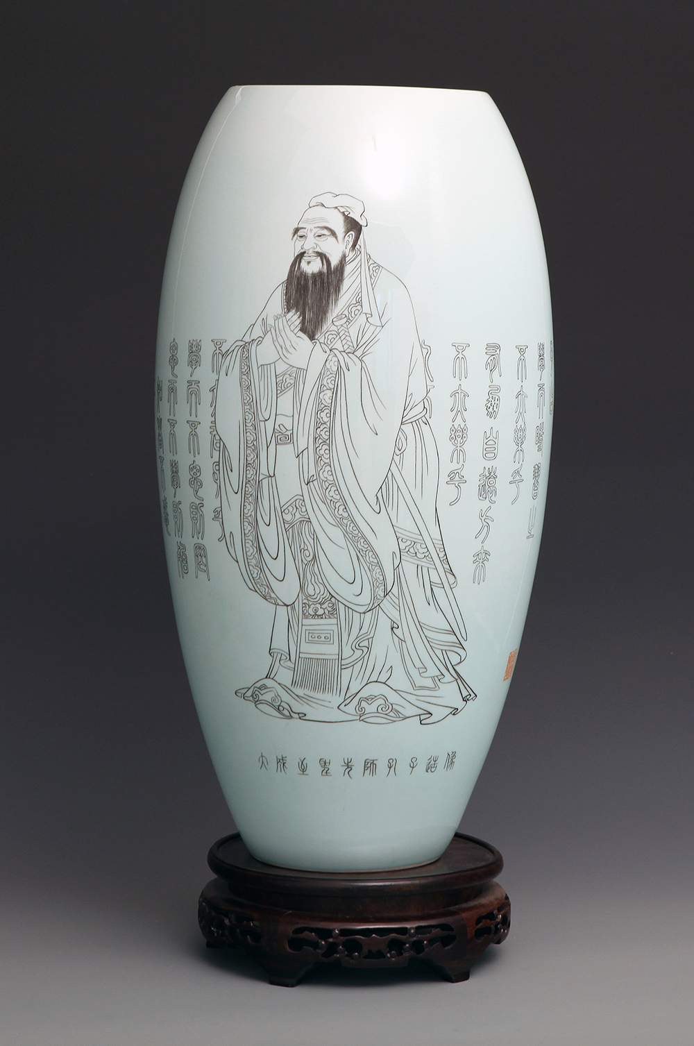 丁邦海《先师孔子造像》刻瓷瓶 高350mm