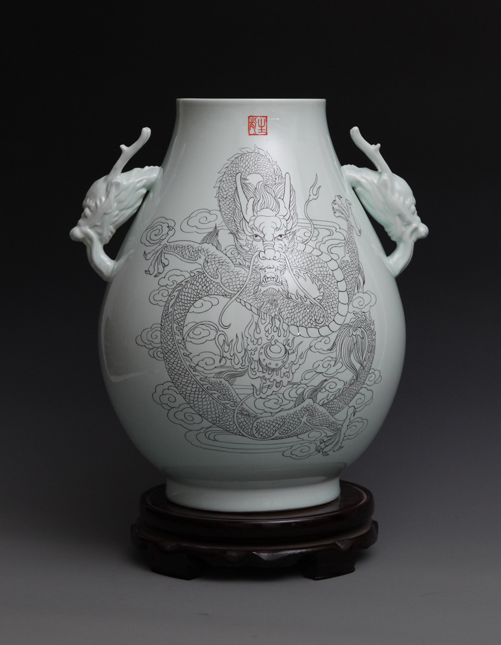 4、《辰龙腾盛世》刻瓷瓶 高400mm