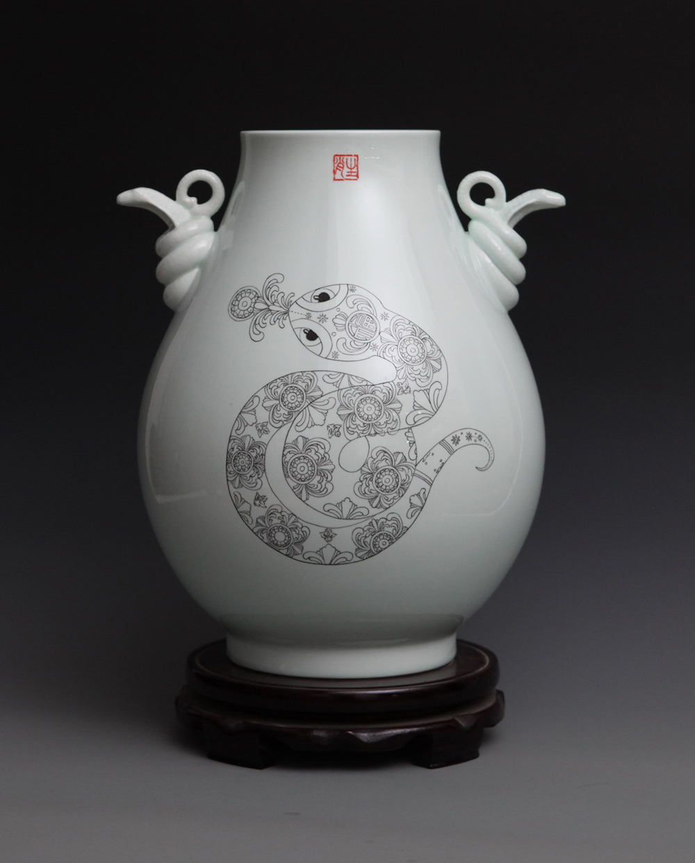 5、《巳蛇呈瑞祥》刻瓷瓶 高400mm