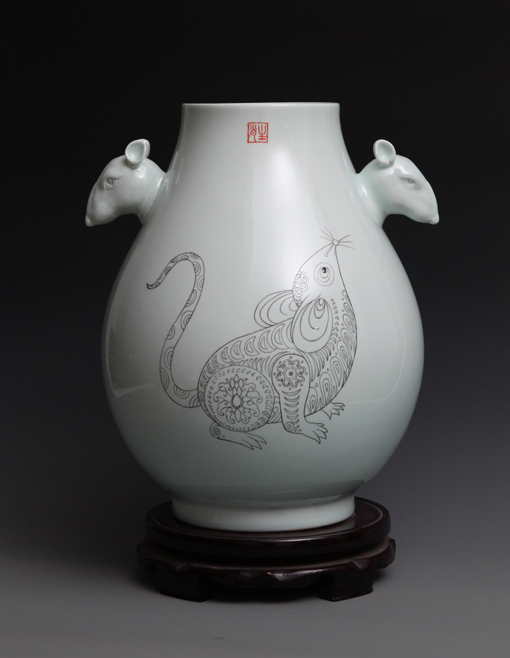 9、《子鼠享安乐》刻瓷瓶 高40mm