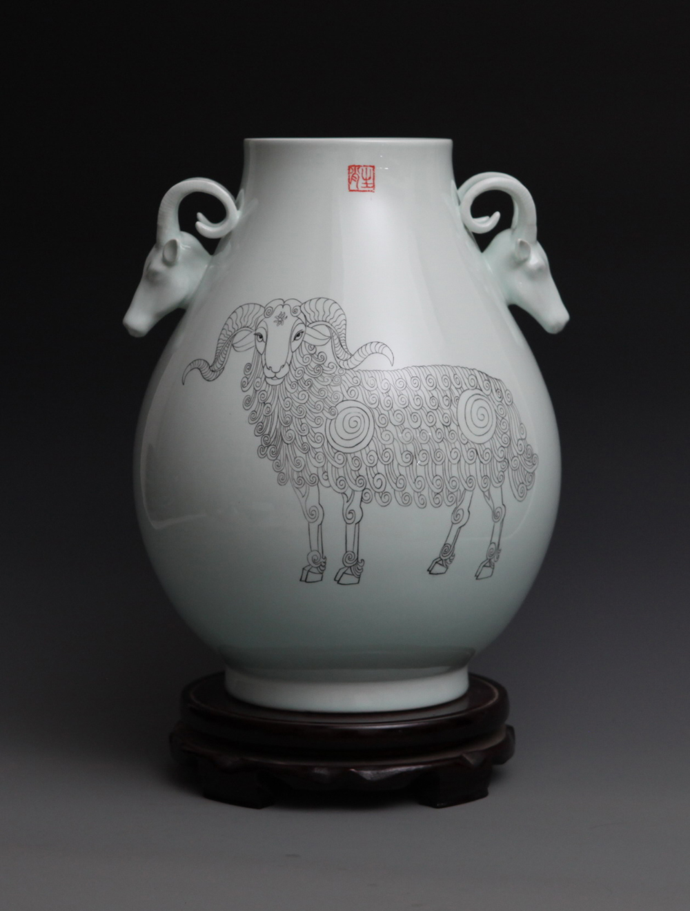 10、《未羊唱新声》刻瓷瓶 高400mm