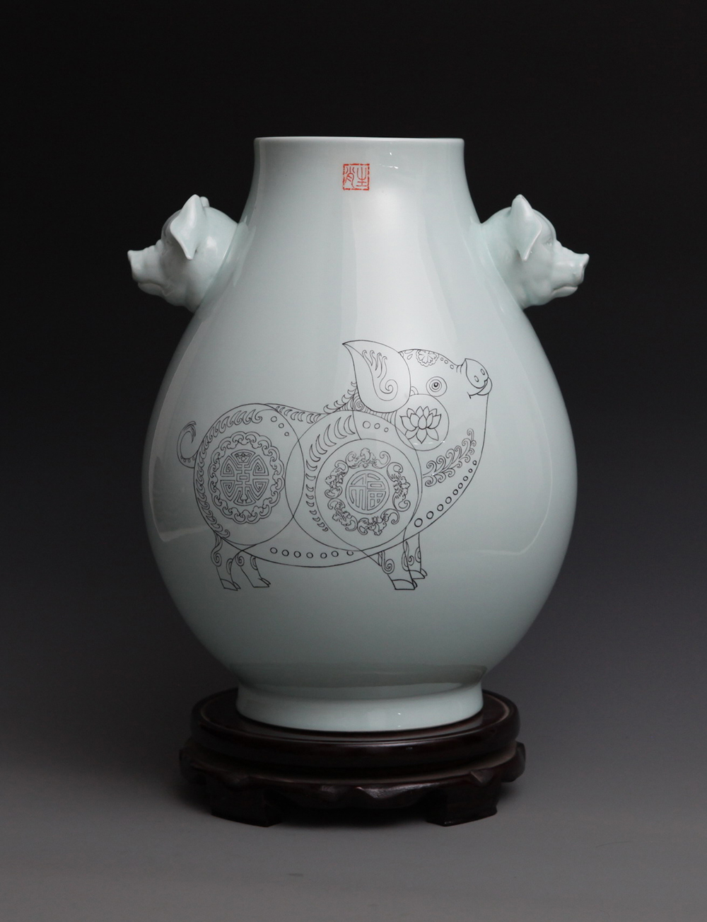 11、《亥猪福寿多》刻瓷瓶 高400mm