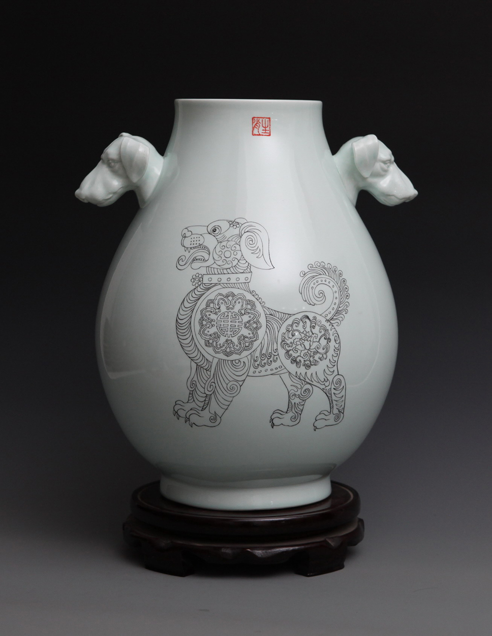 12、《戌狗安详岁》刻瓷瓶 高400mm