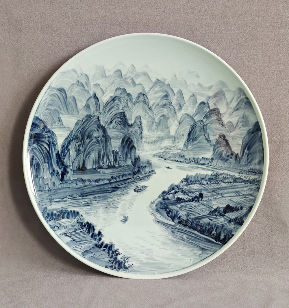 丁邦海《漓江系列》骨瓷青花盘,直径300mm