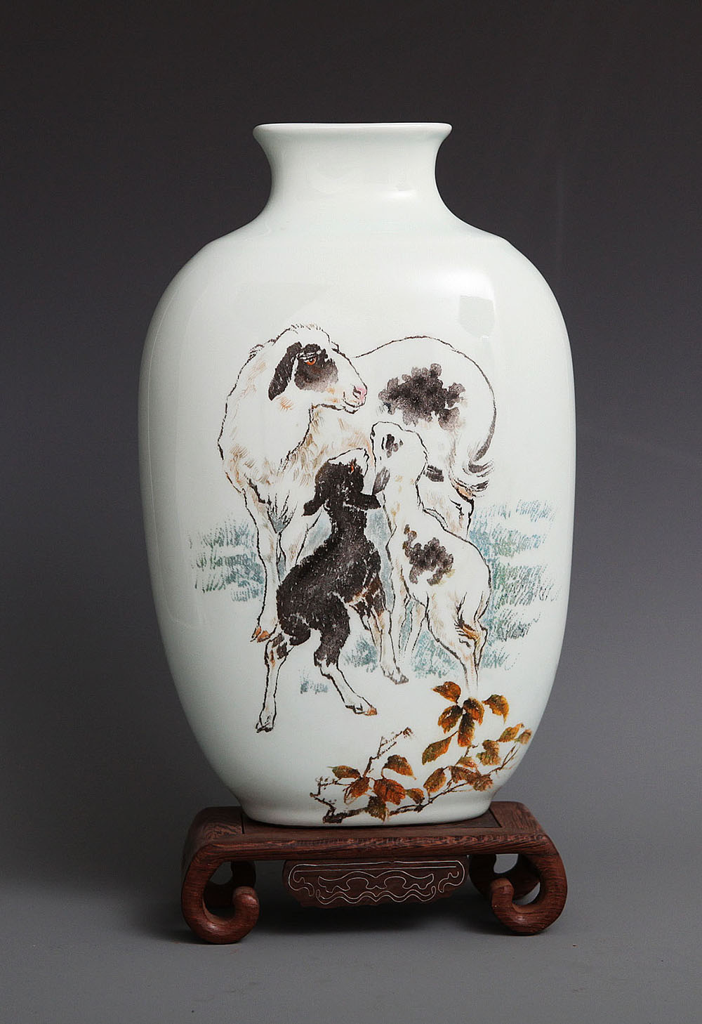 13、丁邦海 《三羊开泰》刻瓷瓶 高300mm