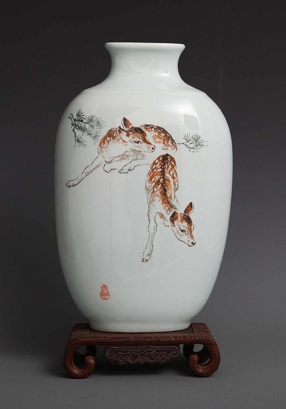 15、丁邦海 《双鹿迎福》刻瓷瓶 高330mm