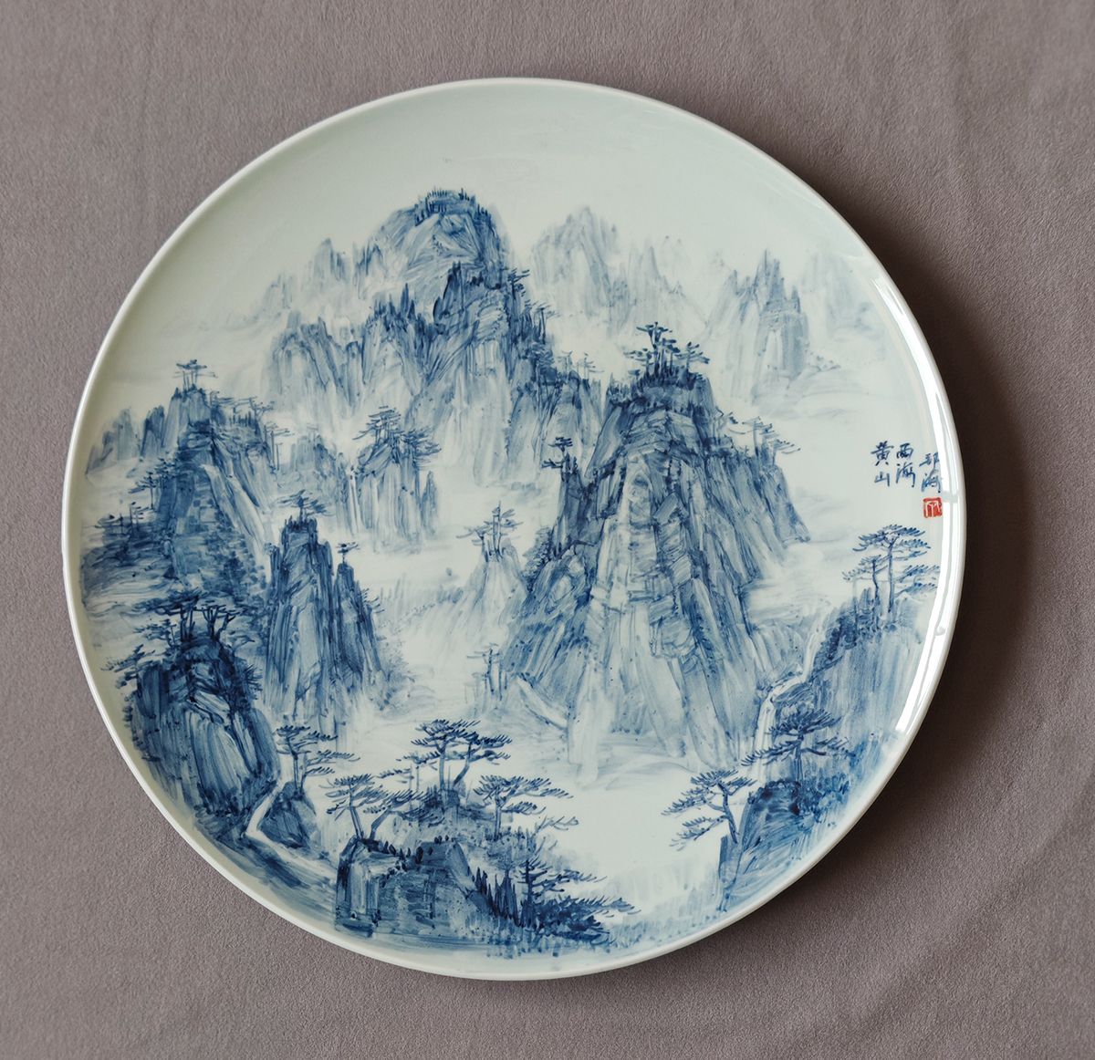 丁邦海《黄山西海》骨瓷青花盘,直径300mm
