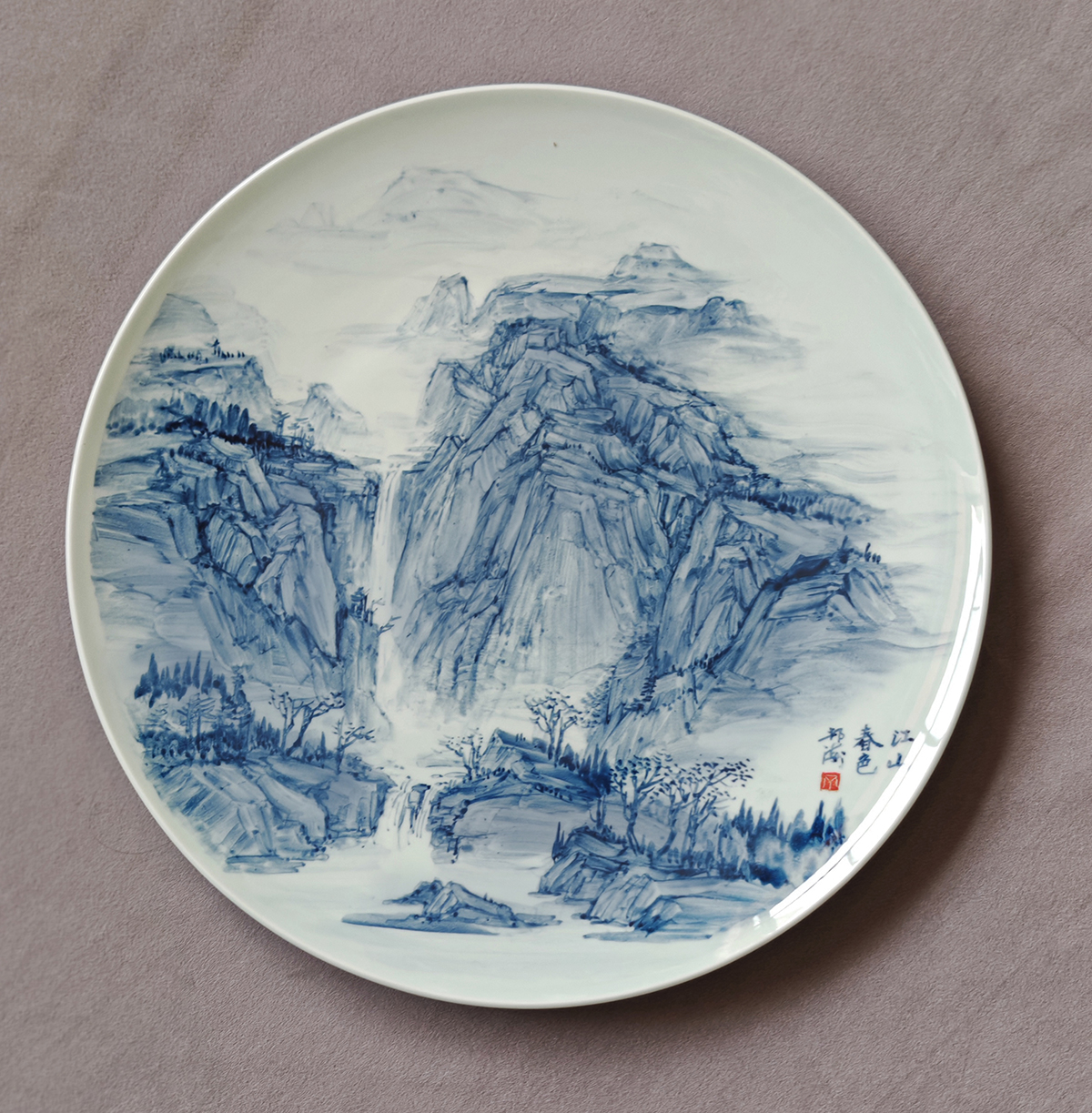 丁邦海《江山春色》骨瓷青花盘,直径300mm