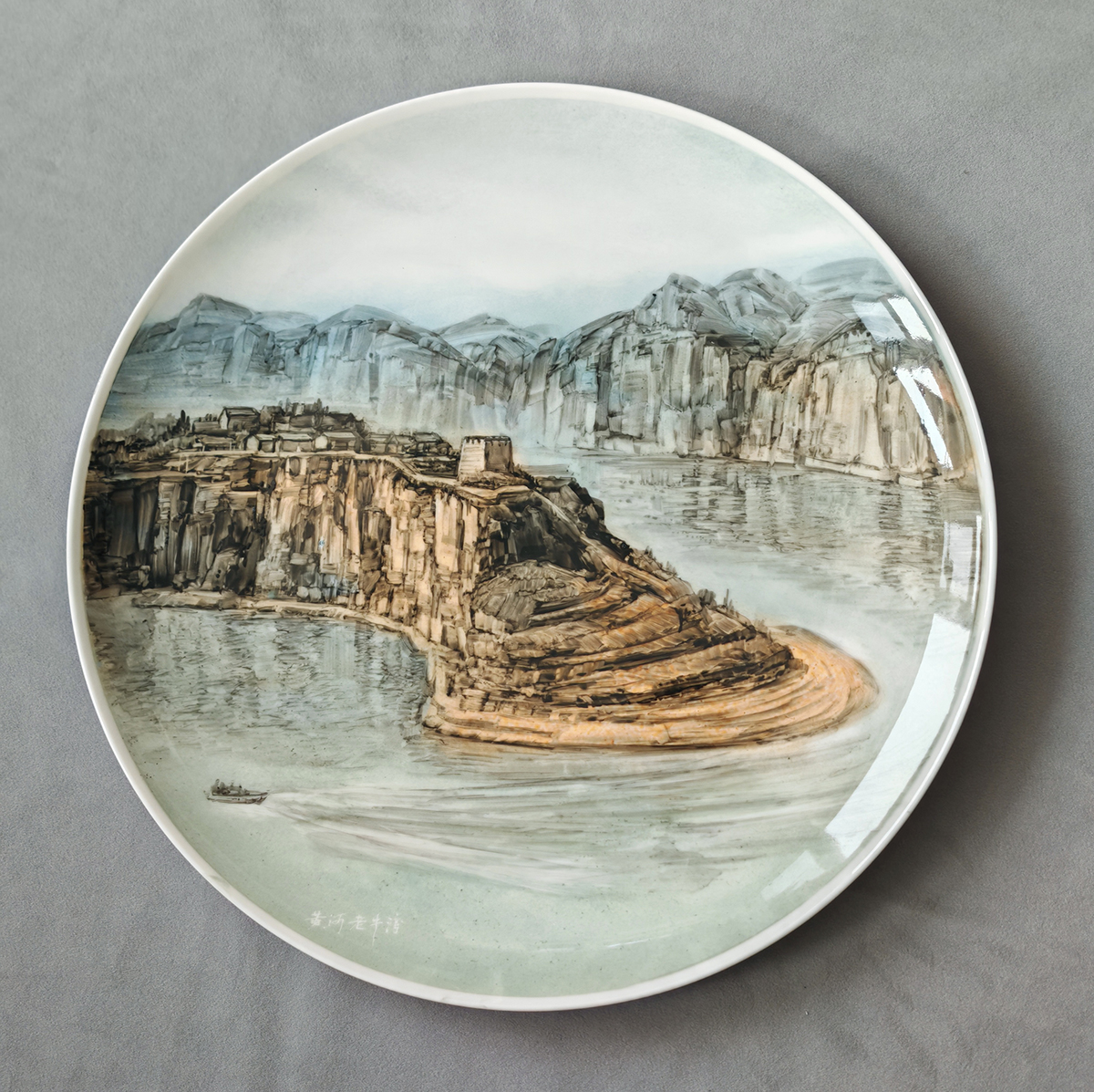 丁邦海《黄河老牛湾》釉上彩绘盘,直径370mm-丁邦海刻瓷|丁邦海 黄玉双刻瓷艺术