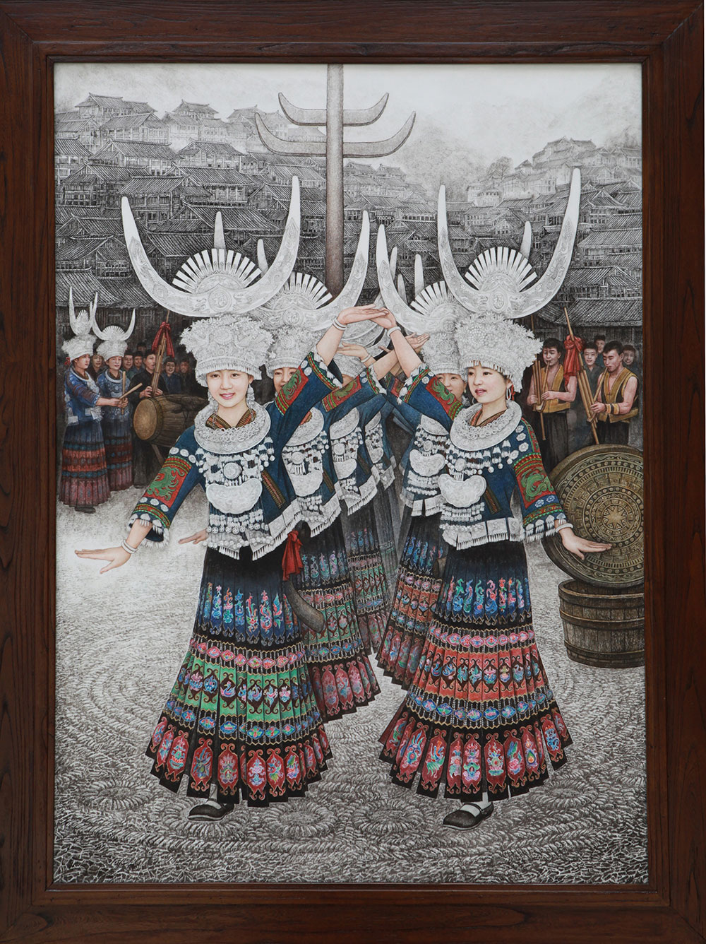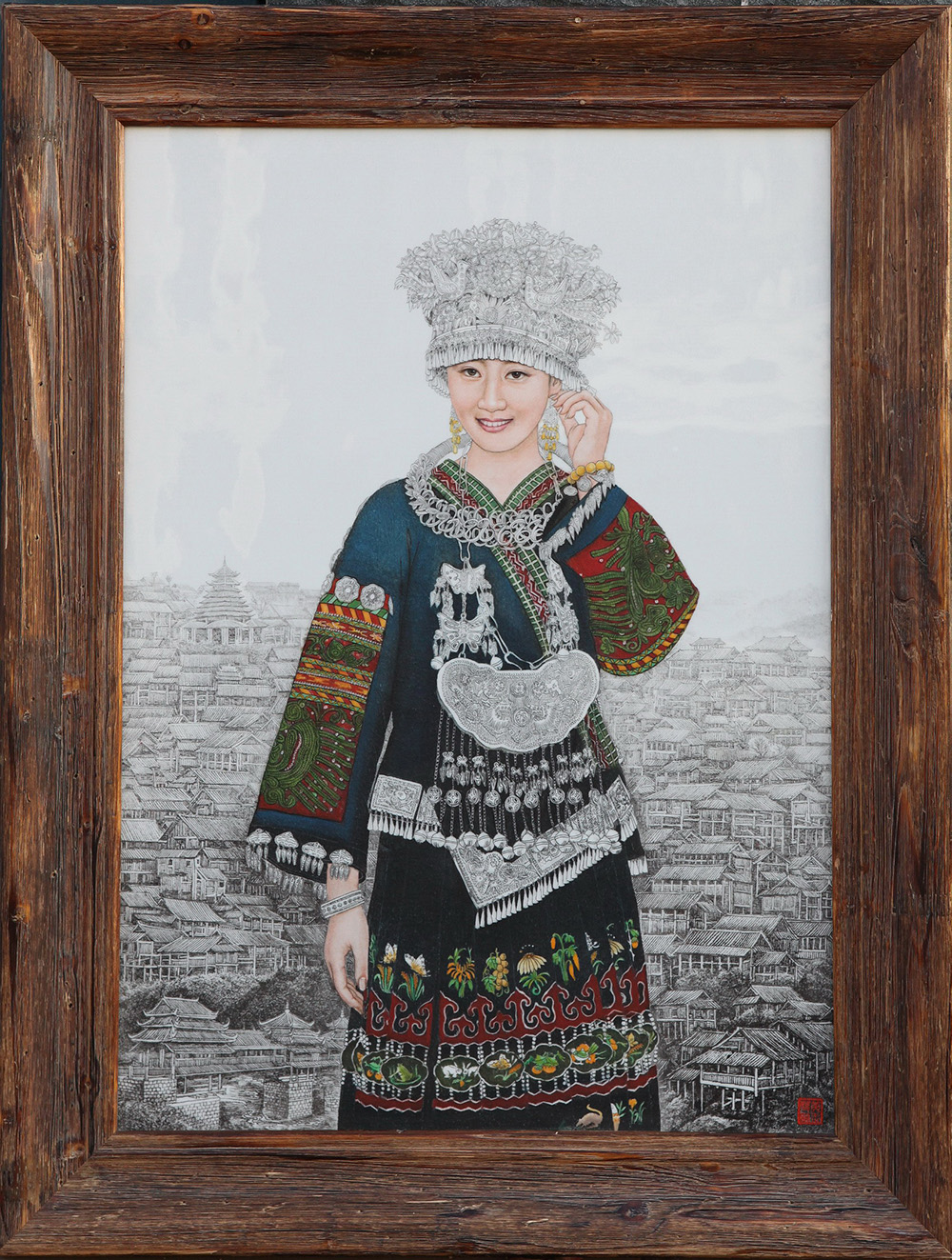 丁邦海《醉苗乡》刻瓷板,高1400mm,宽100mm