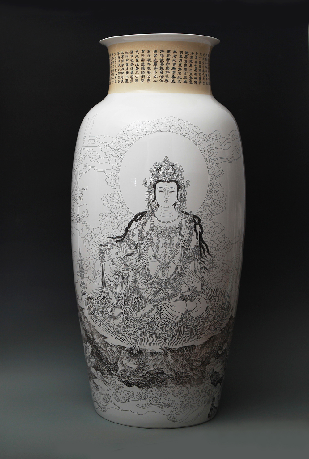 黄玉双《观世音菩萨》刻瓷瓶 高1000mm