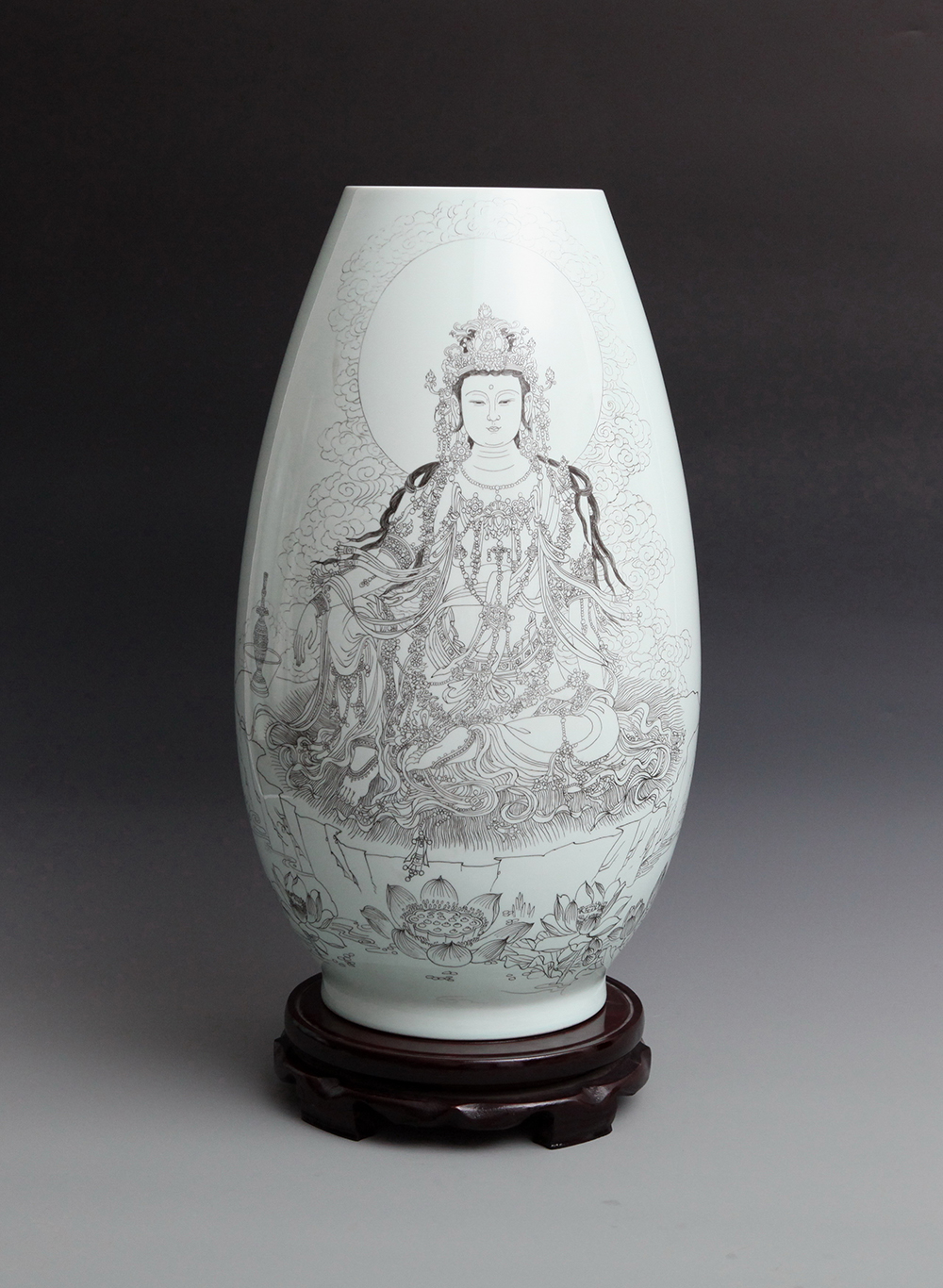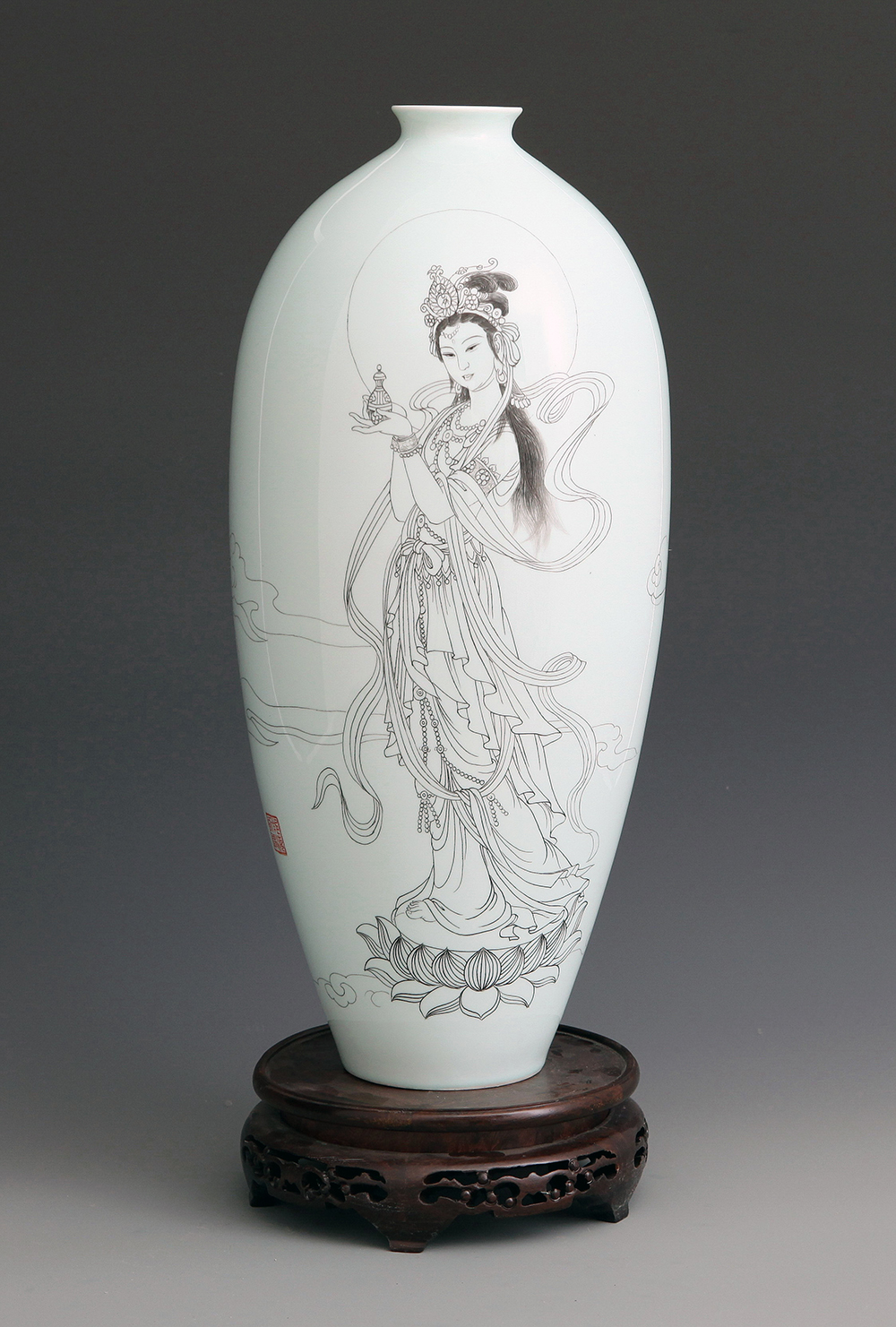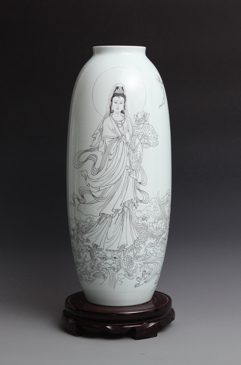 丁邦海《持瓶观音保平安》刻瓷瓶 高400mm