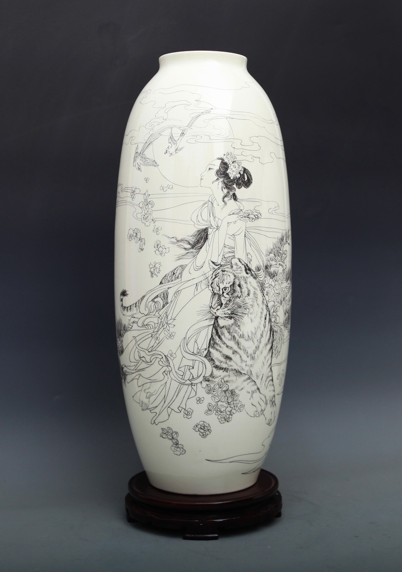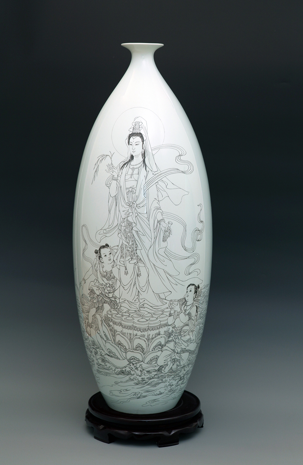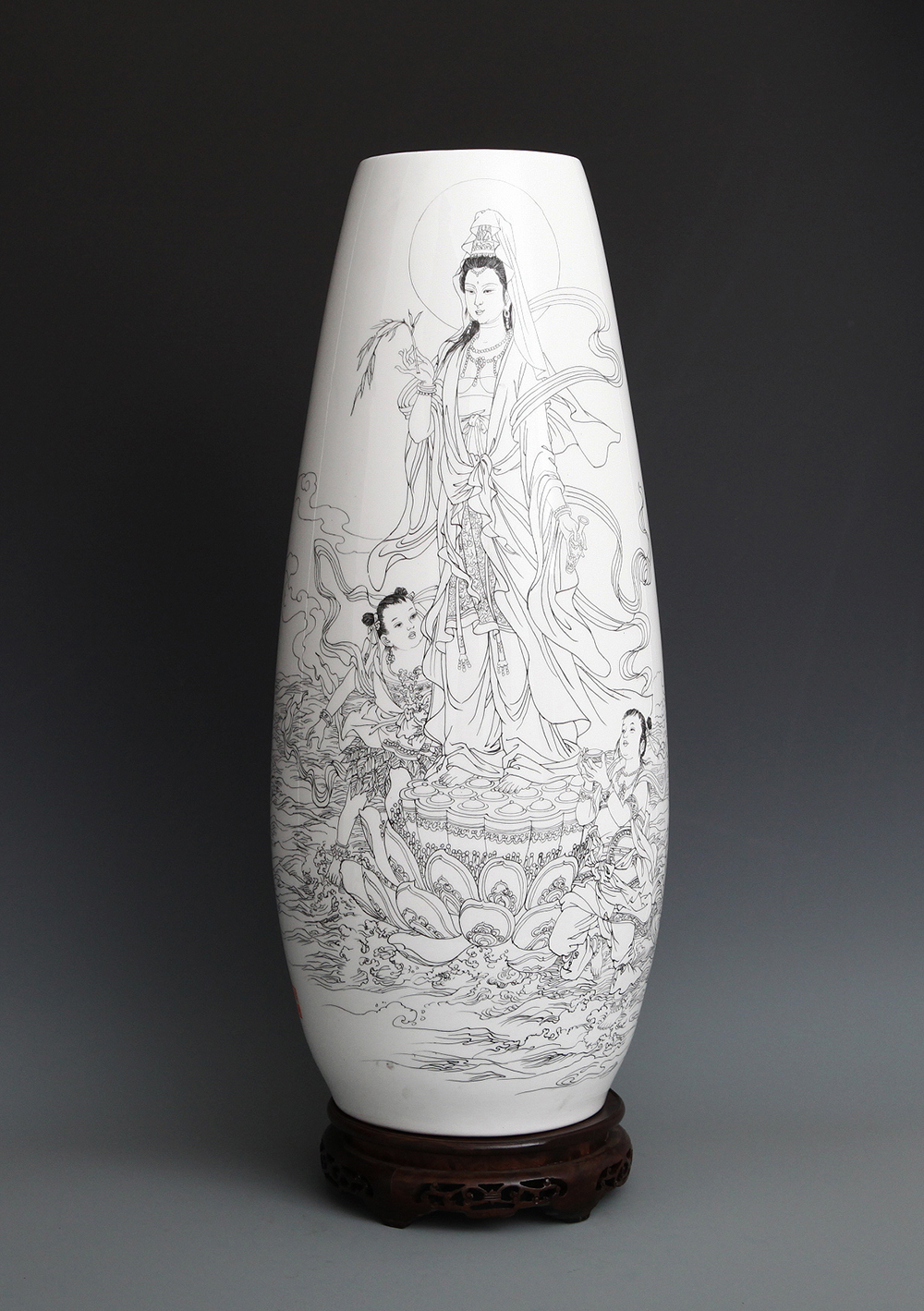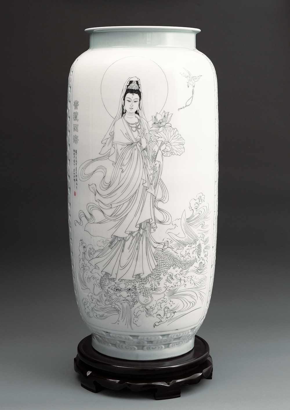 丁邦海《持瓶观音保平安》刻瓷瓶 高510mm,