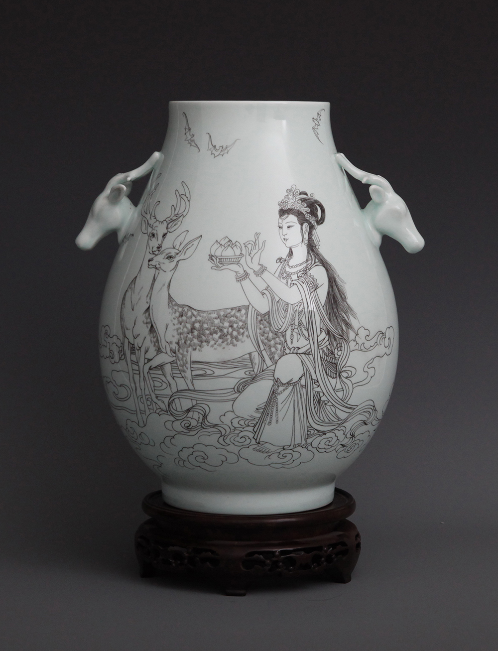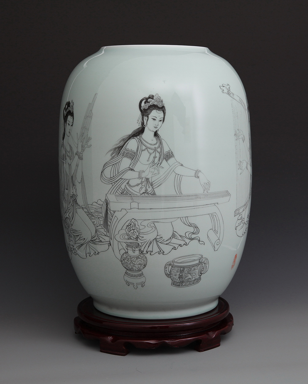 丁邦海《一曲佳音送祝福》刻瓷瓶 高320mm。