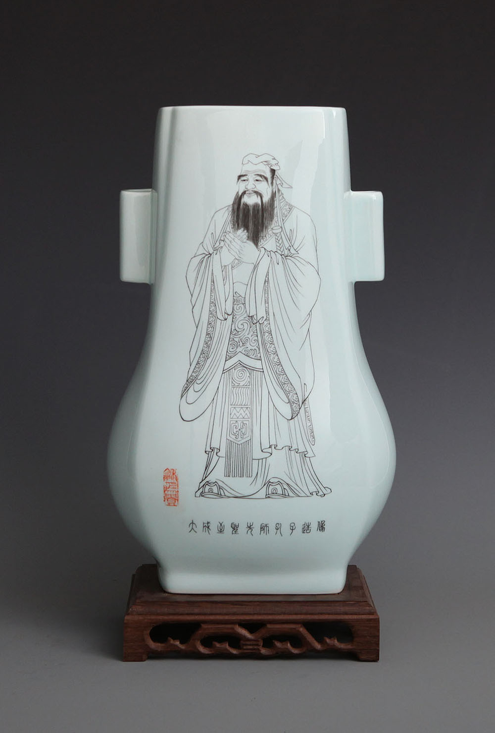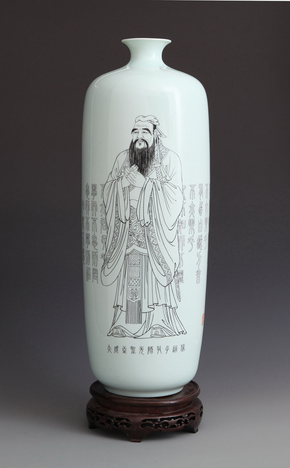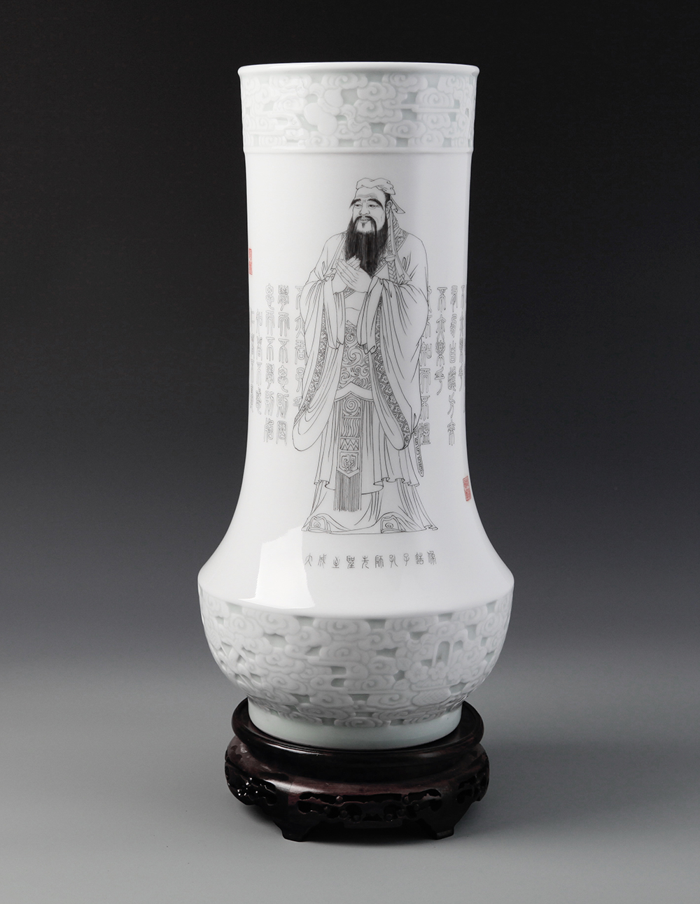 丁邦海《大成至圣先师孔子造像》刻瓷瓶 高350mm