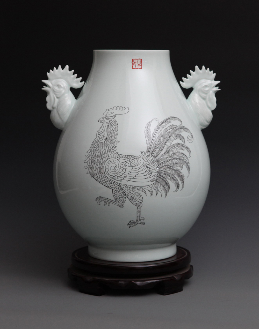 6、《酉鸡呈吉祥》刻瓷瓶 高400mm
