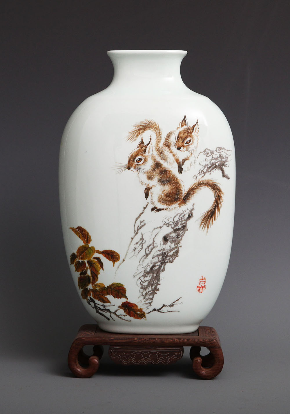 11、丁邦海 《鼠享安乐图》刻瓷瓶 高320mm