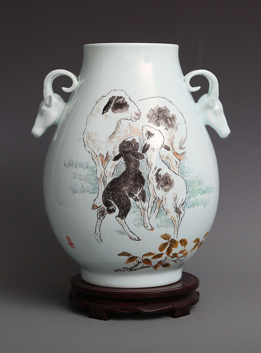 12、丁邦海 《三羊开泰》刻瓷瓶 高320mm