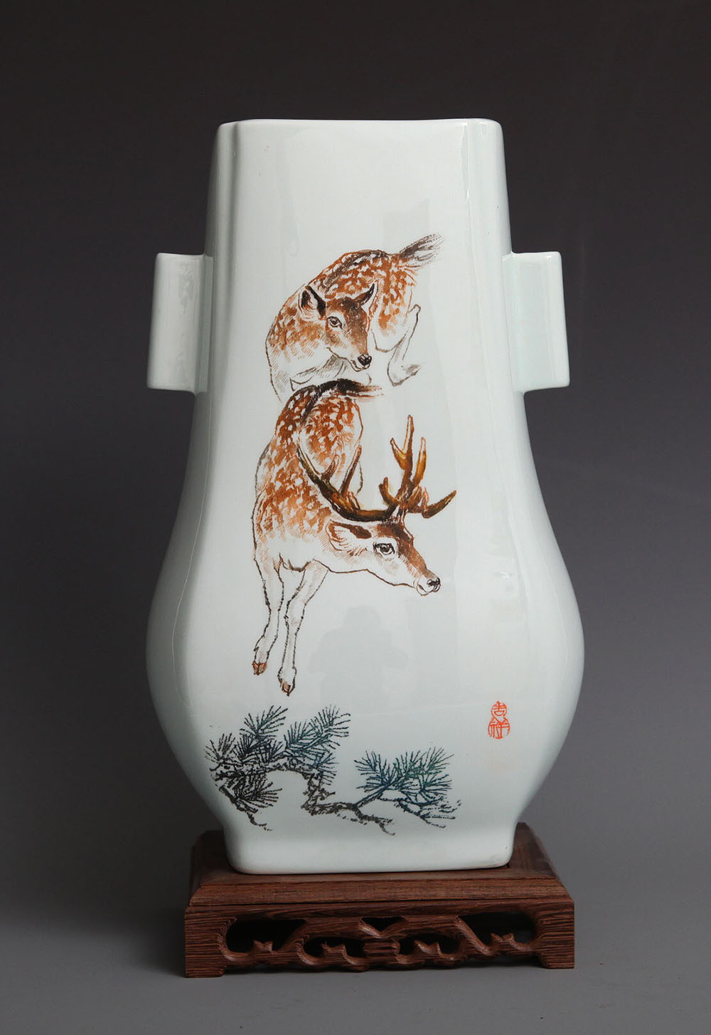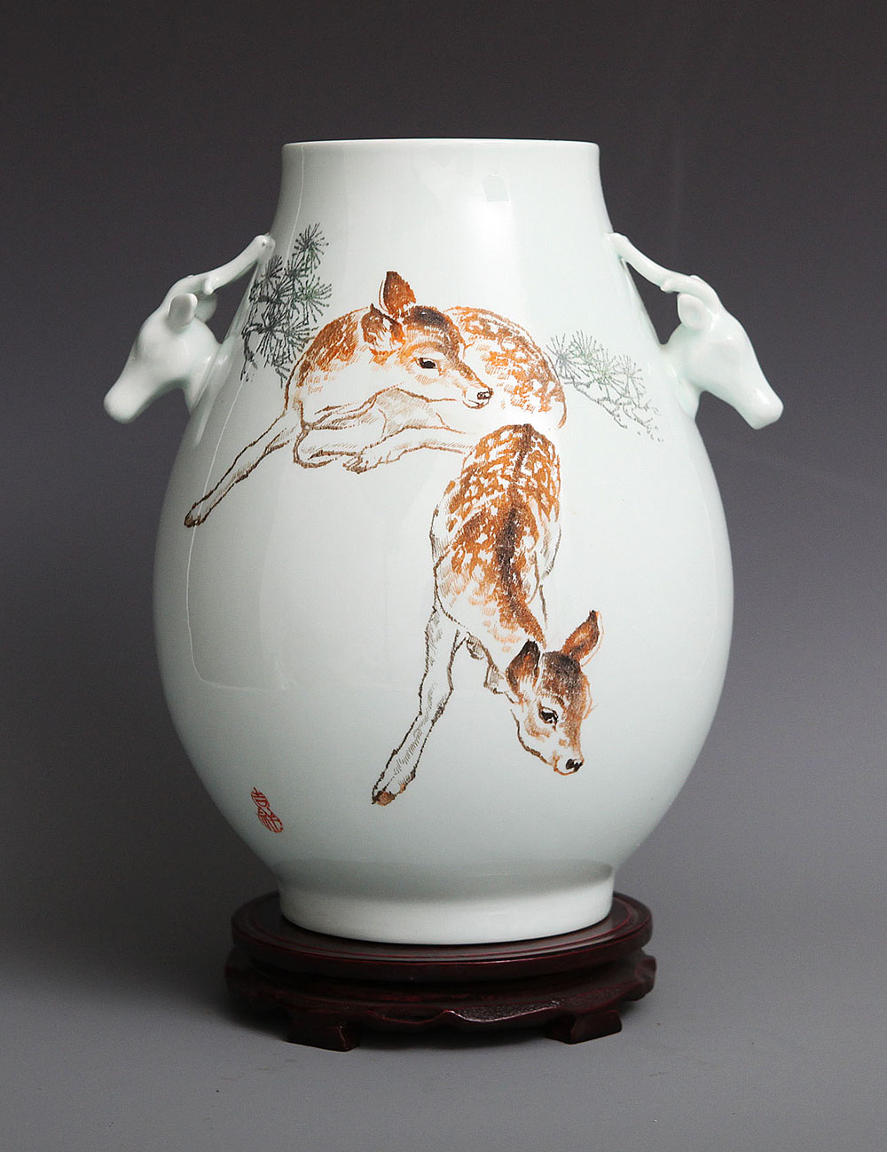 15、丁邦海 《双鹿迎福》刻瓷瓶 高330mm
