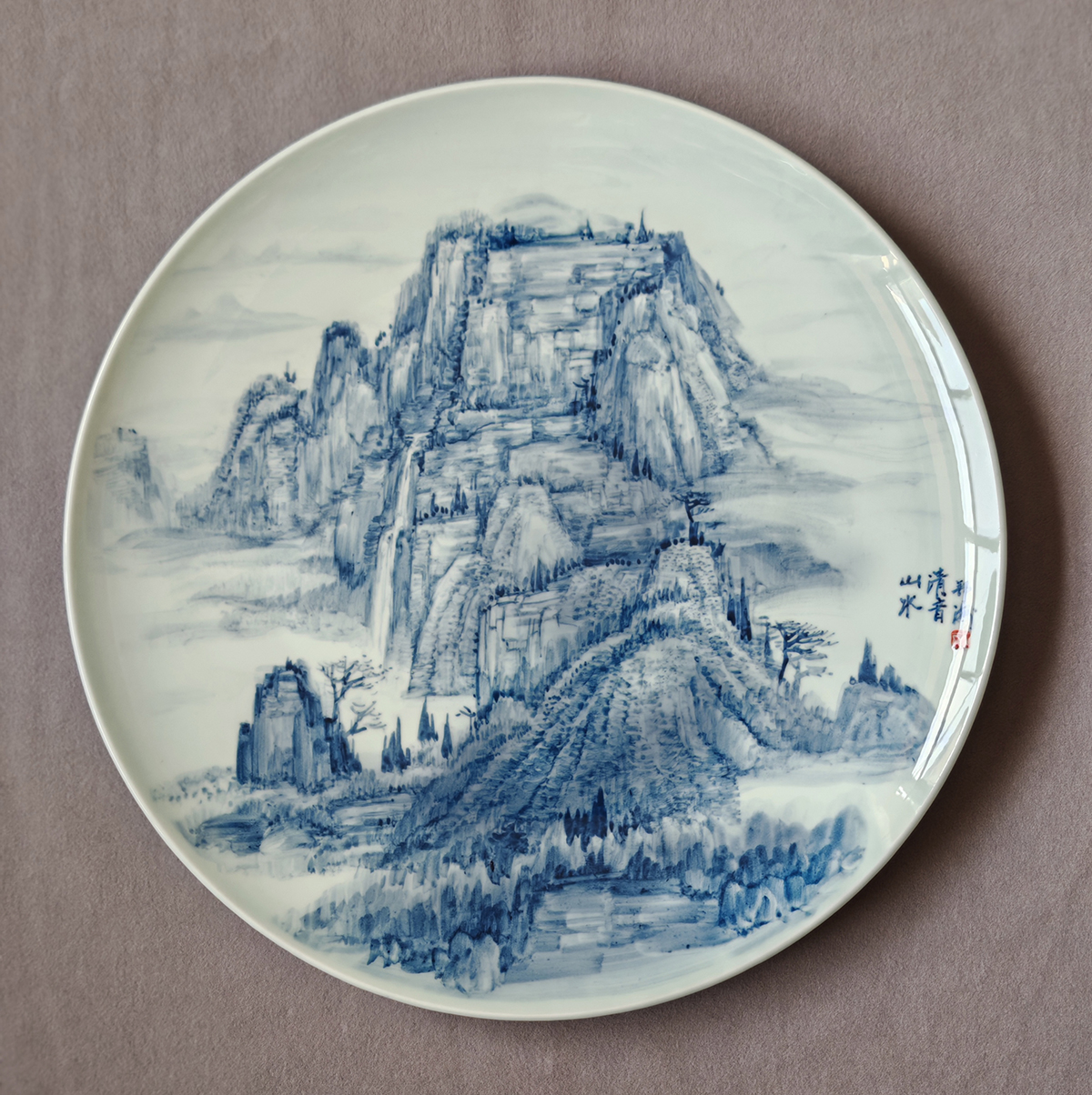 丁邦海《山水清音》骨瓷青花盘,直径300mm